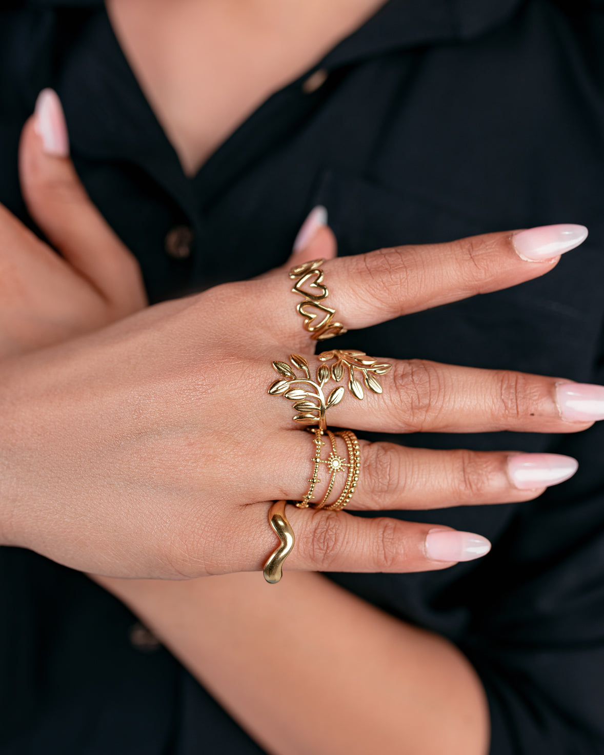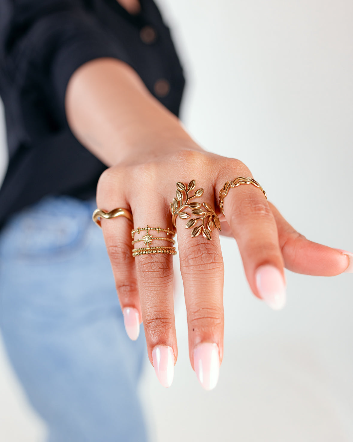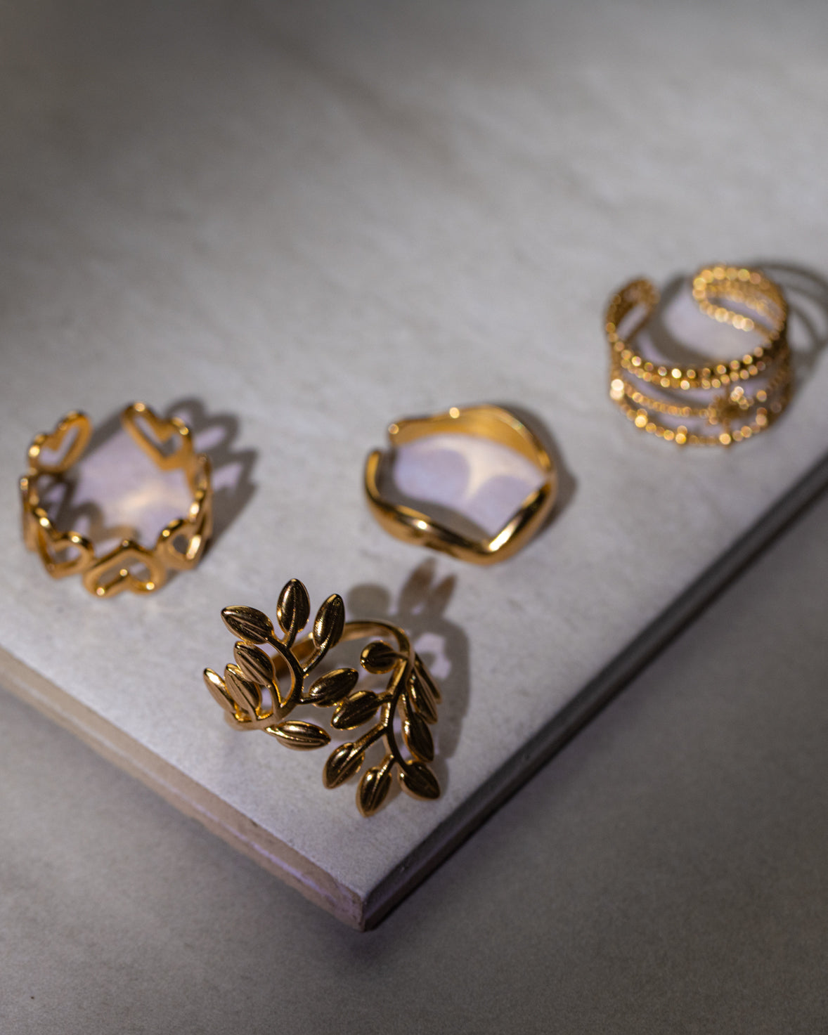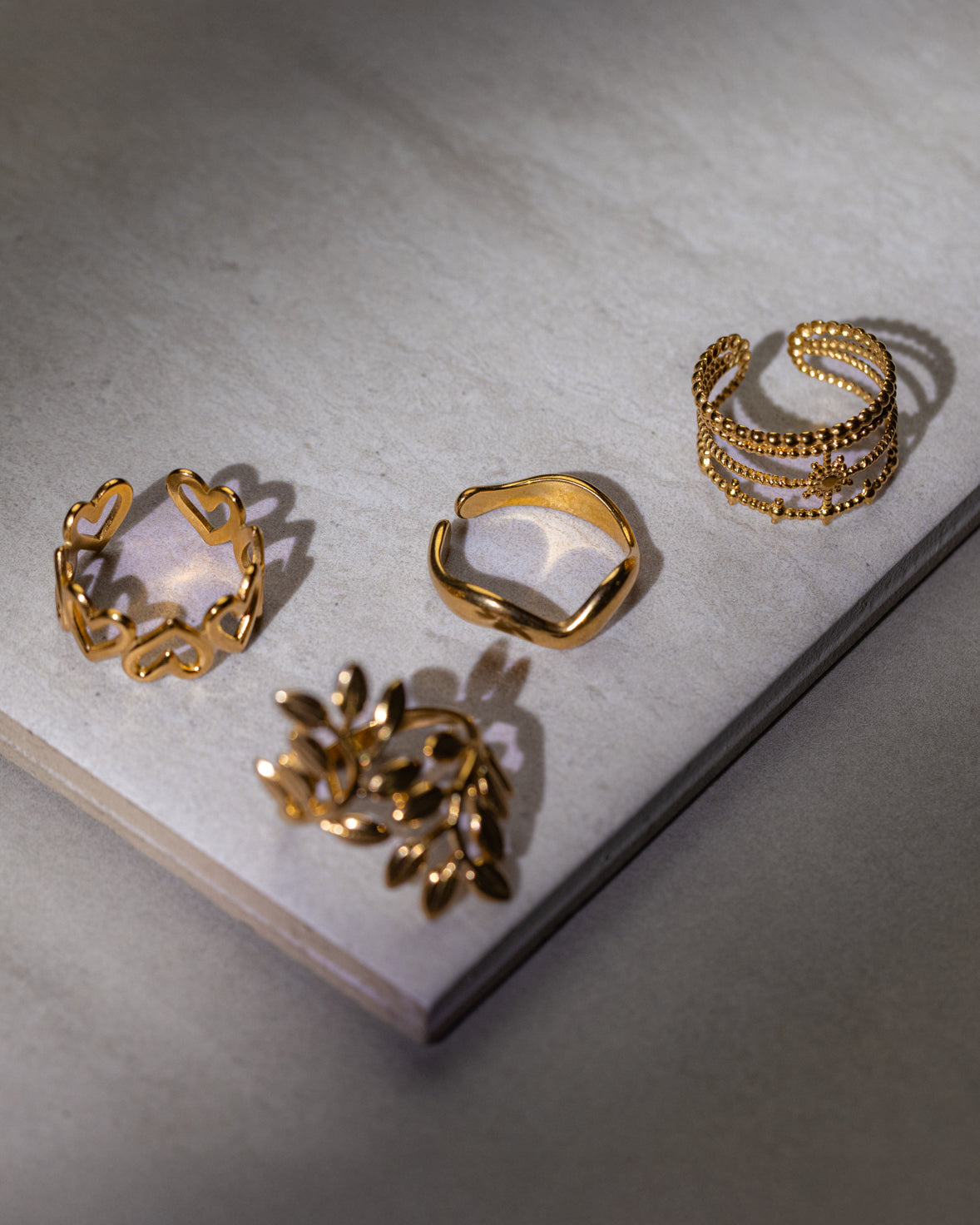 A chic set of four gold-plated cuff rings, each featuring unique decorative elements to add a touch of elegance to any ensemble.