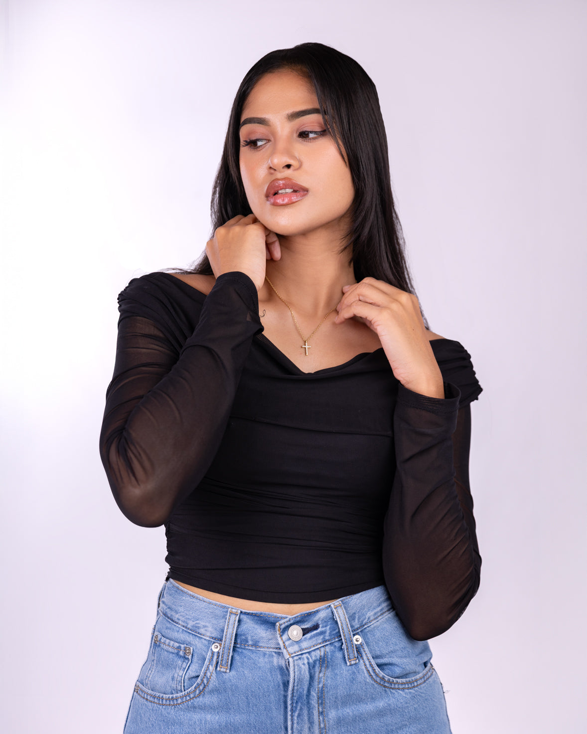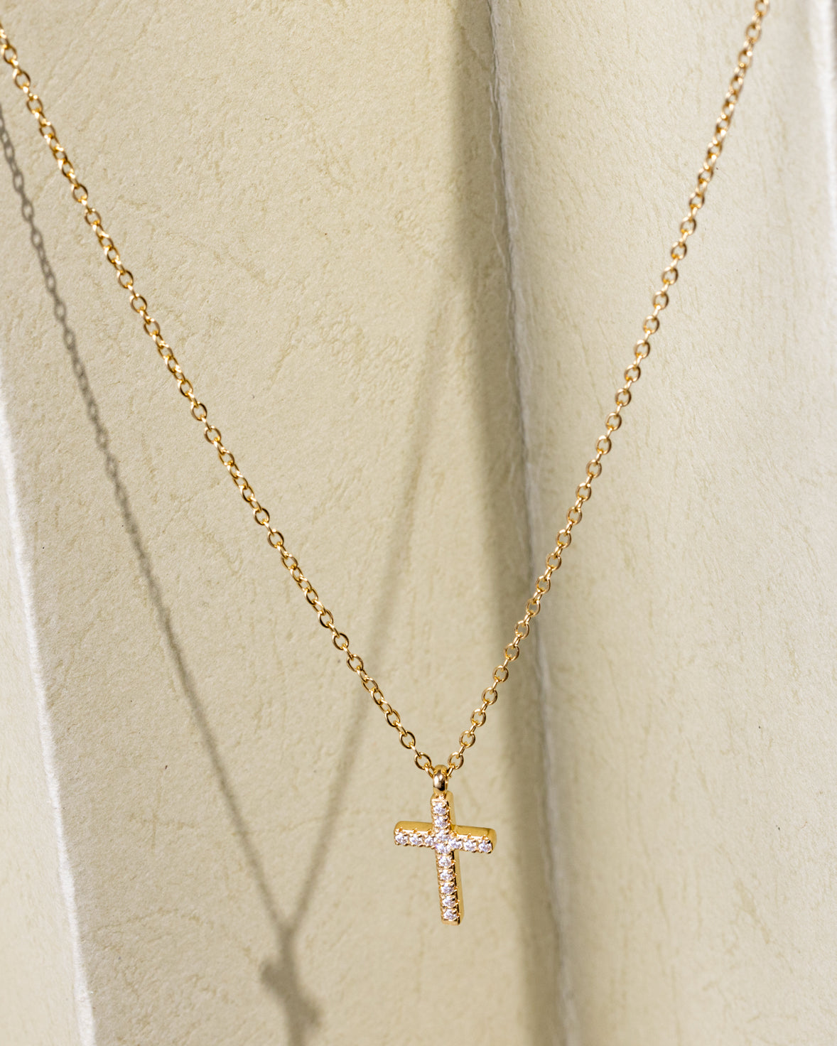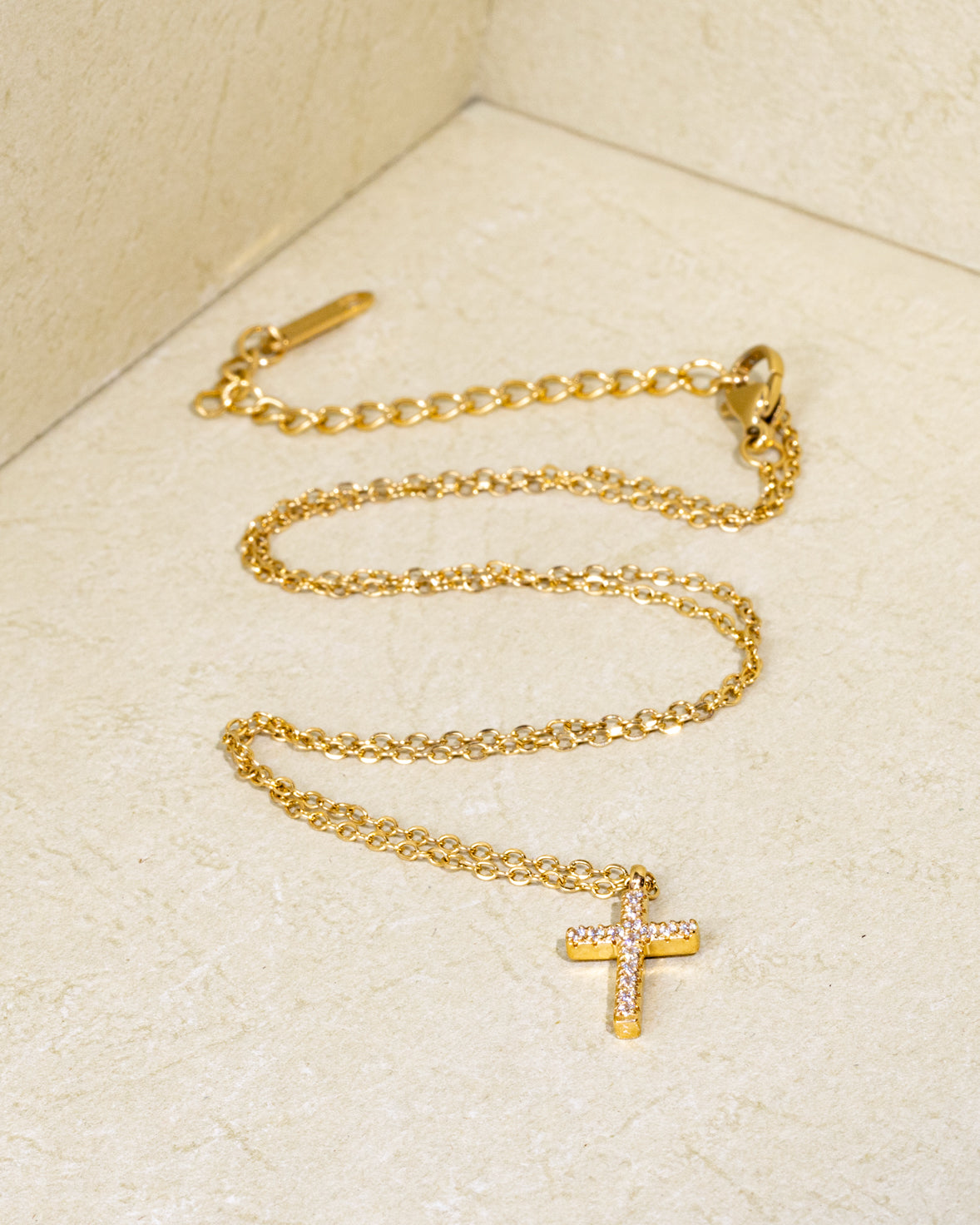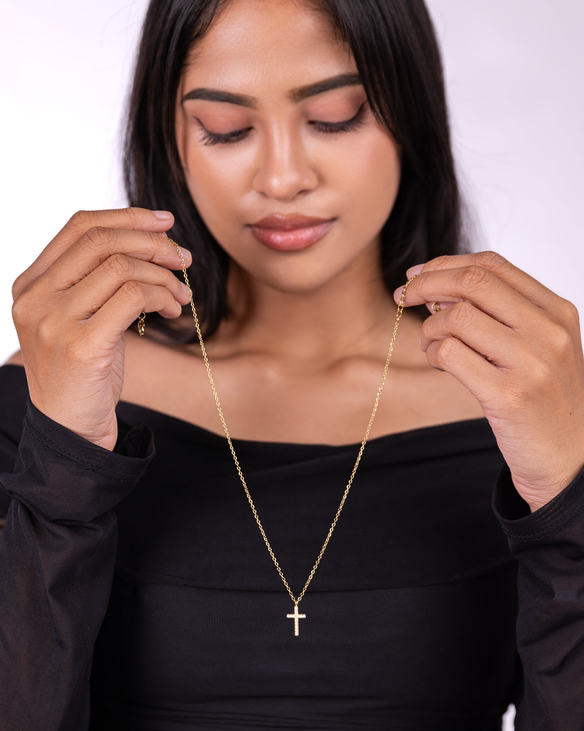 A classy cross pendant adorned with shimmering stones—elegant, stylish, and perfect for both casual and dressy looks.