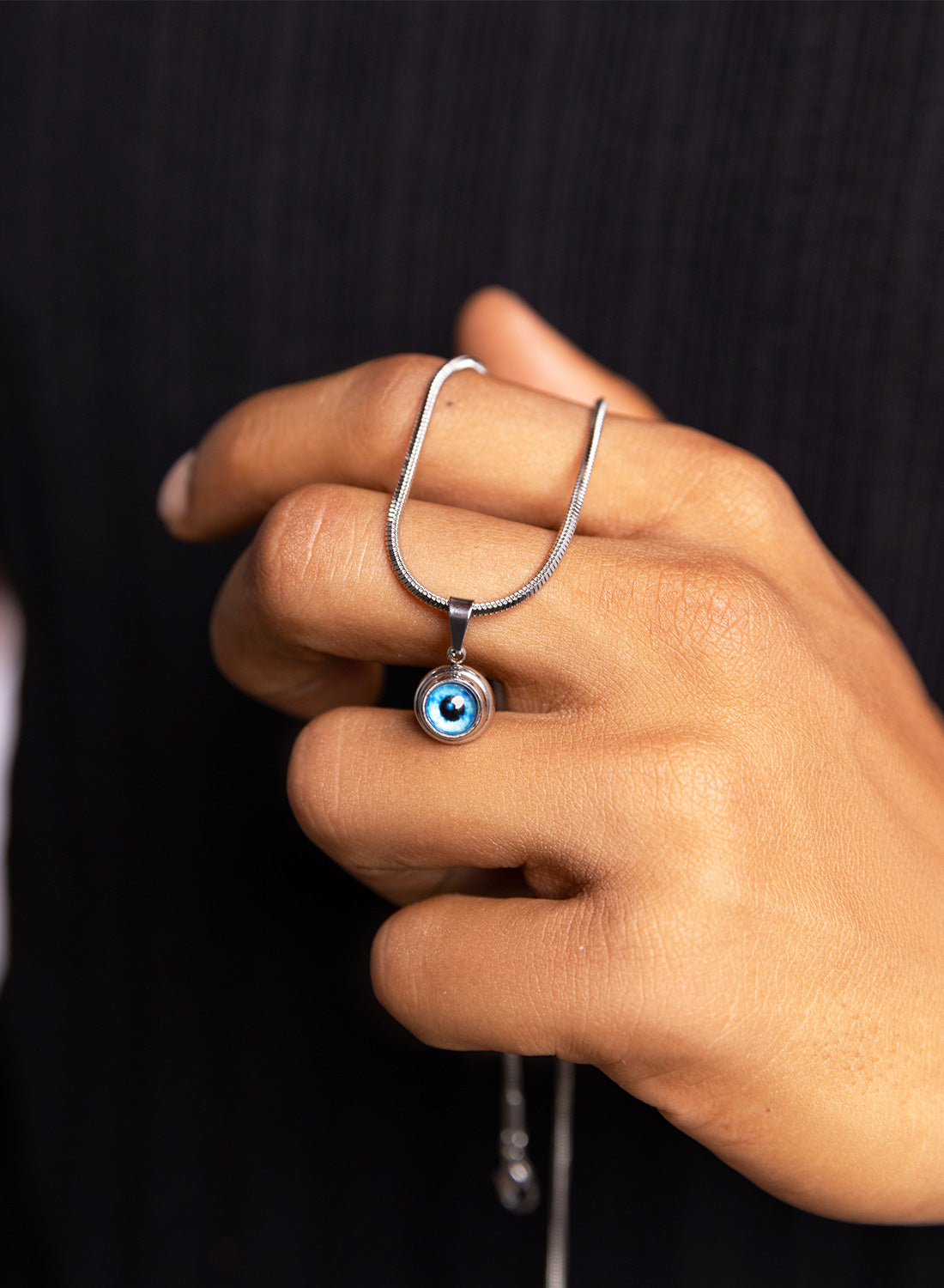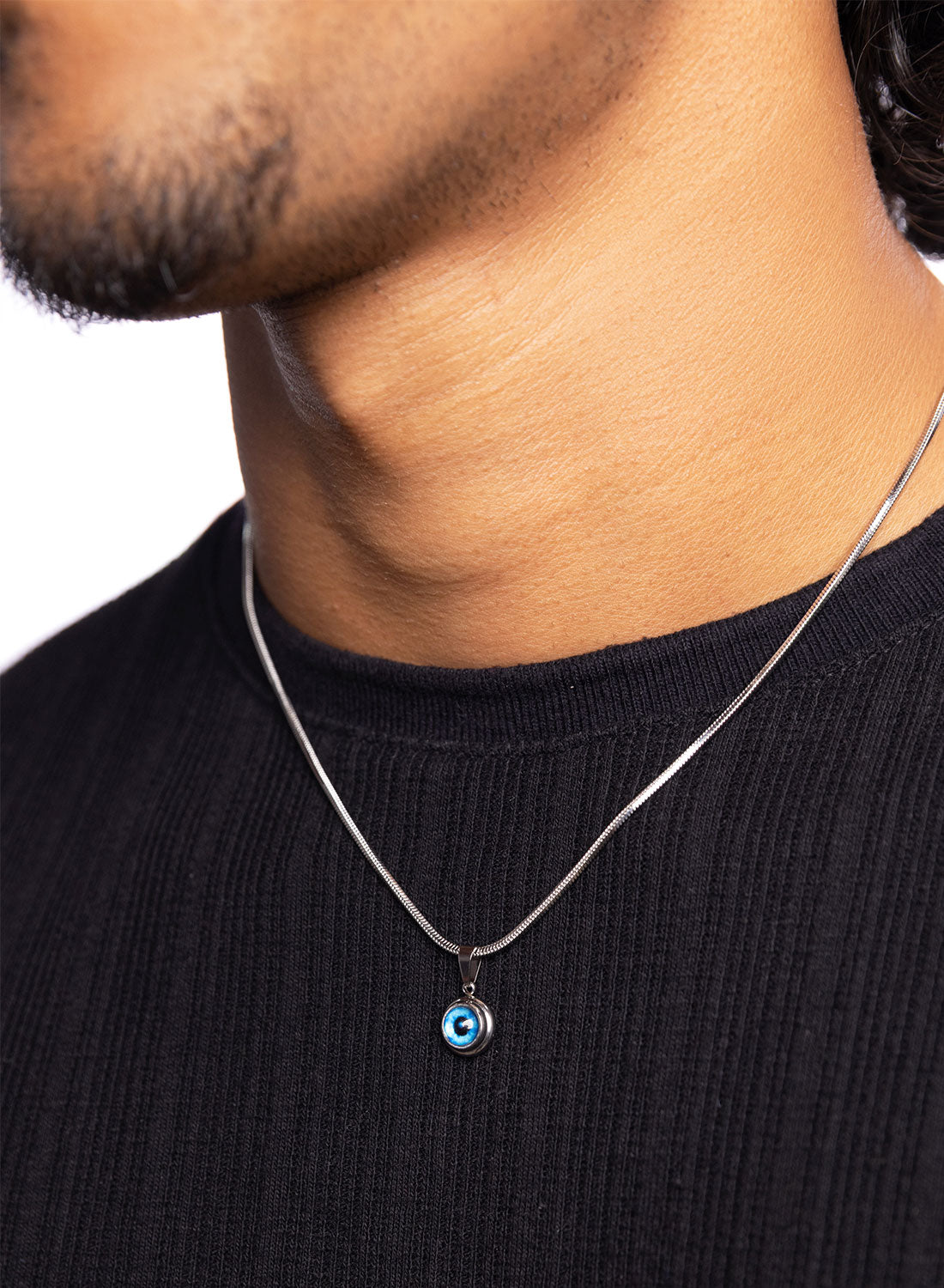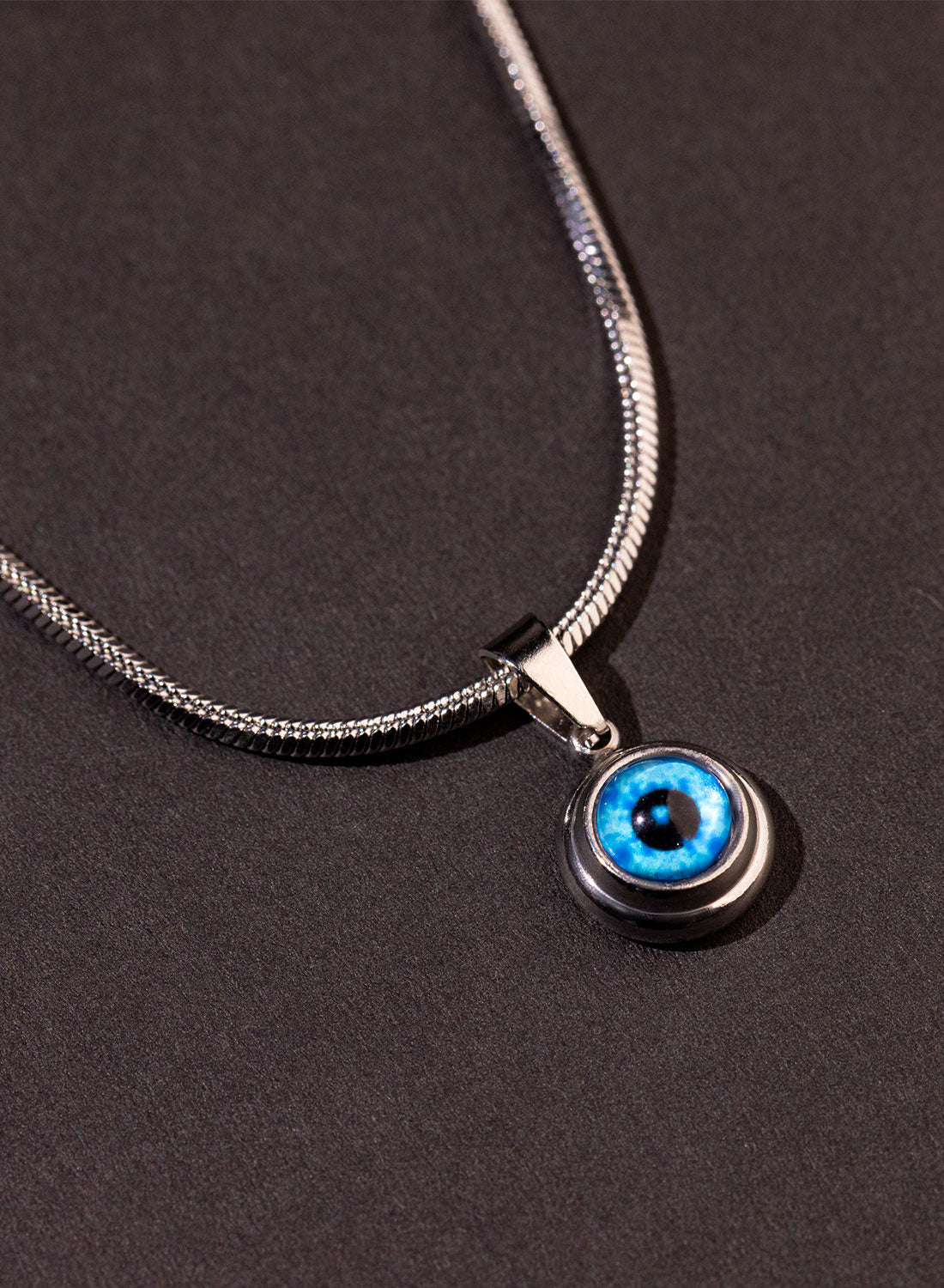 A bold yet minimalist necklace featuring a striking evil-eye pendant. This sleek design adds a meaningful yet refined touch, perfect for those who appreciate subtle accessories with symbolic charm.