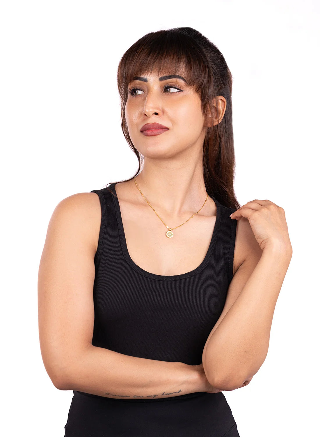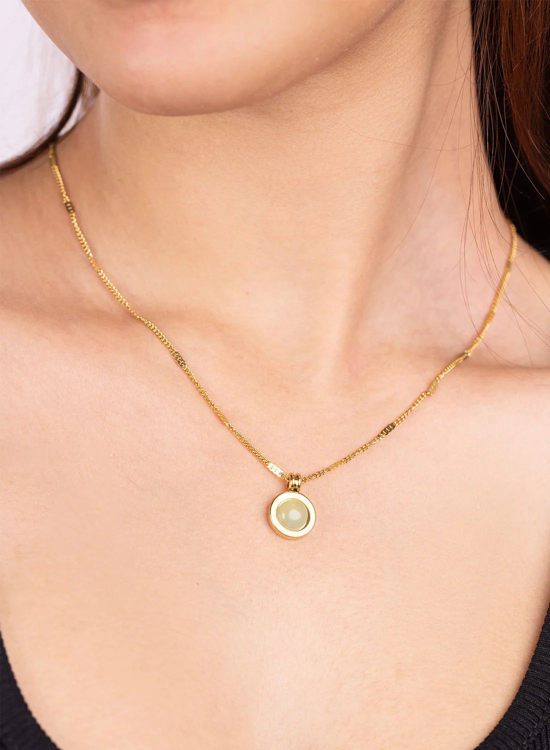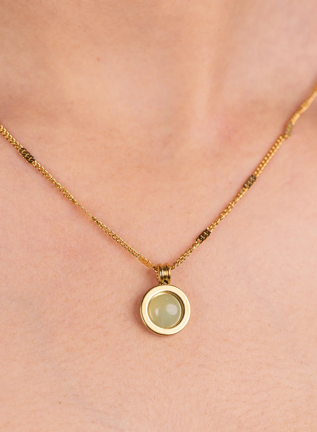 A refined necklace designed to bring natural elegance and sophistication to any outfit. Featuring a polished round jade pendant on a sleek gold chain, this piece blends timeless style with modern B Classy charm.