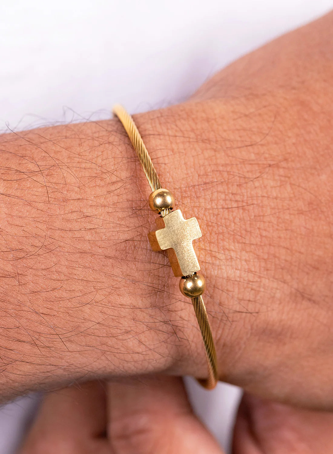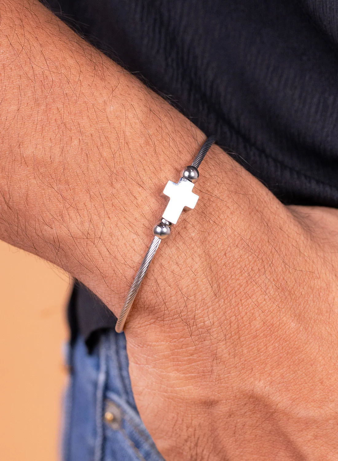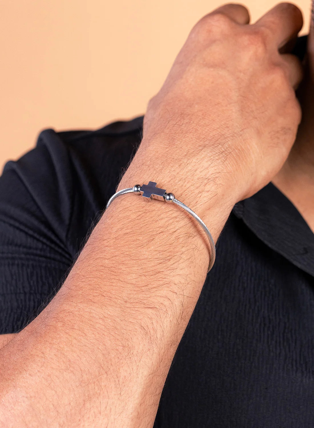 A bold and refined cuff designed for men who prefer clean structure with meaningful detail. Featuring a sleek open bangle design with a subtle cross accent, this piece delivers a strong, modern statement — the true B Classy standard.